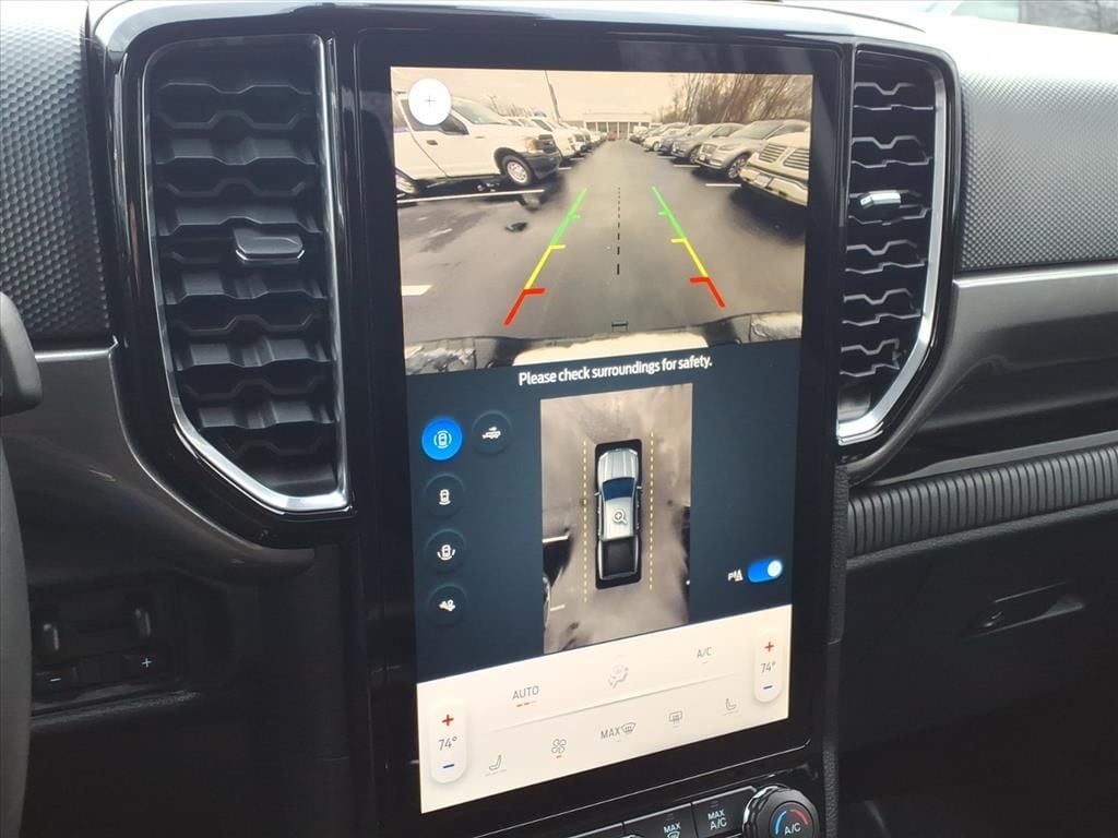 Inside, the Ranger's spacious cabin is outfitted with premium cloth front bucket seats, dual-zone electronic climate control, and a 12-inch display in the center stack. The power-sliding rear window and black running boards add both style and functionality to this exceptional truck.